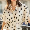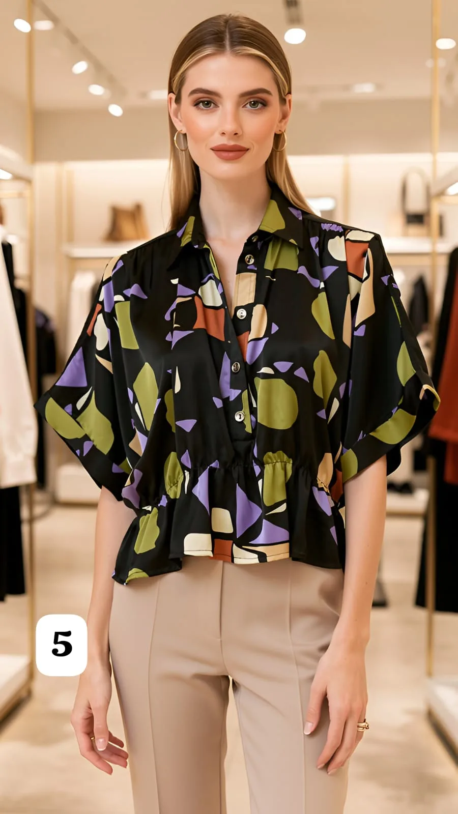 blusa con cuello manga doblada arrugada abajo de sartén estampada