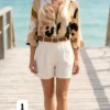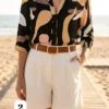 camisa Lino cuello Mao estampada manga 3/4