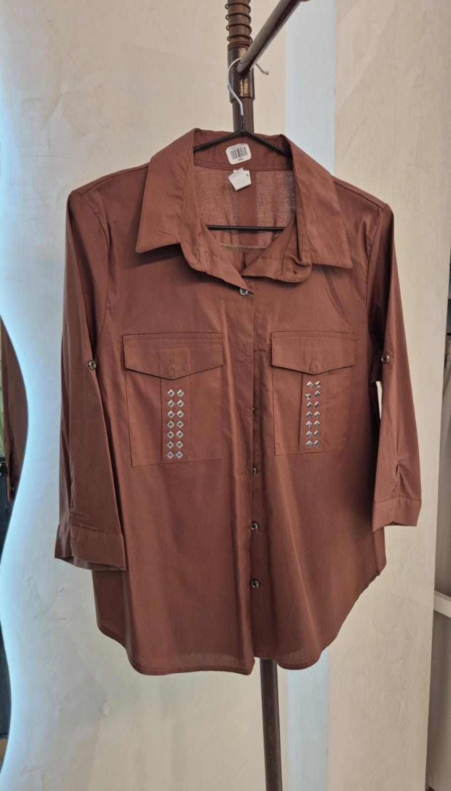 Camisa manga 3/4 tela poplin con tachas y tapa bolsillo