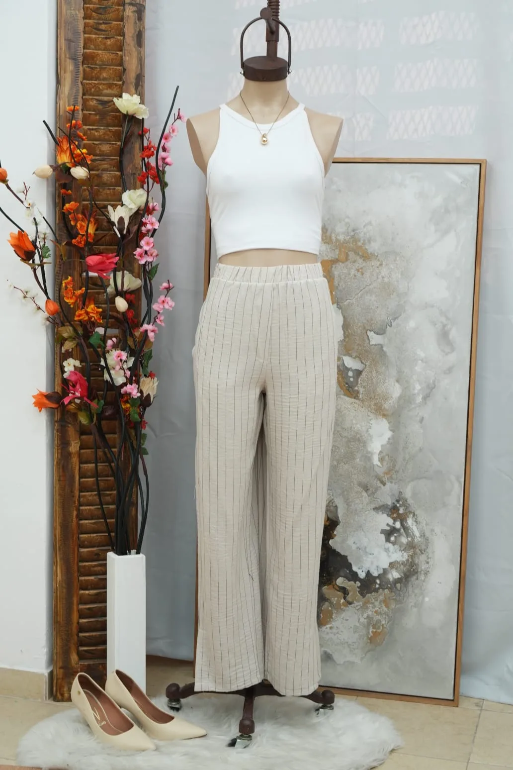 pantalon de lino rayado con tajo
