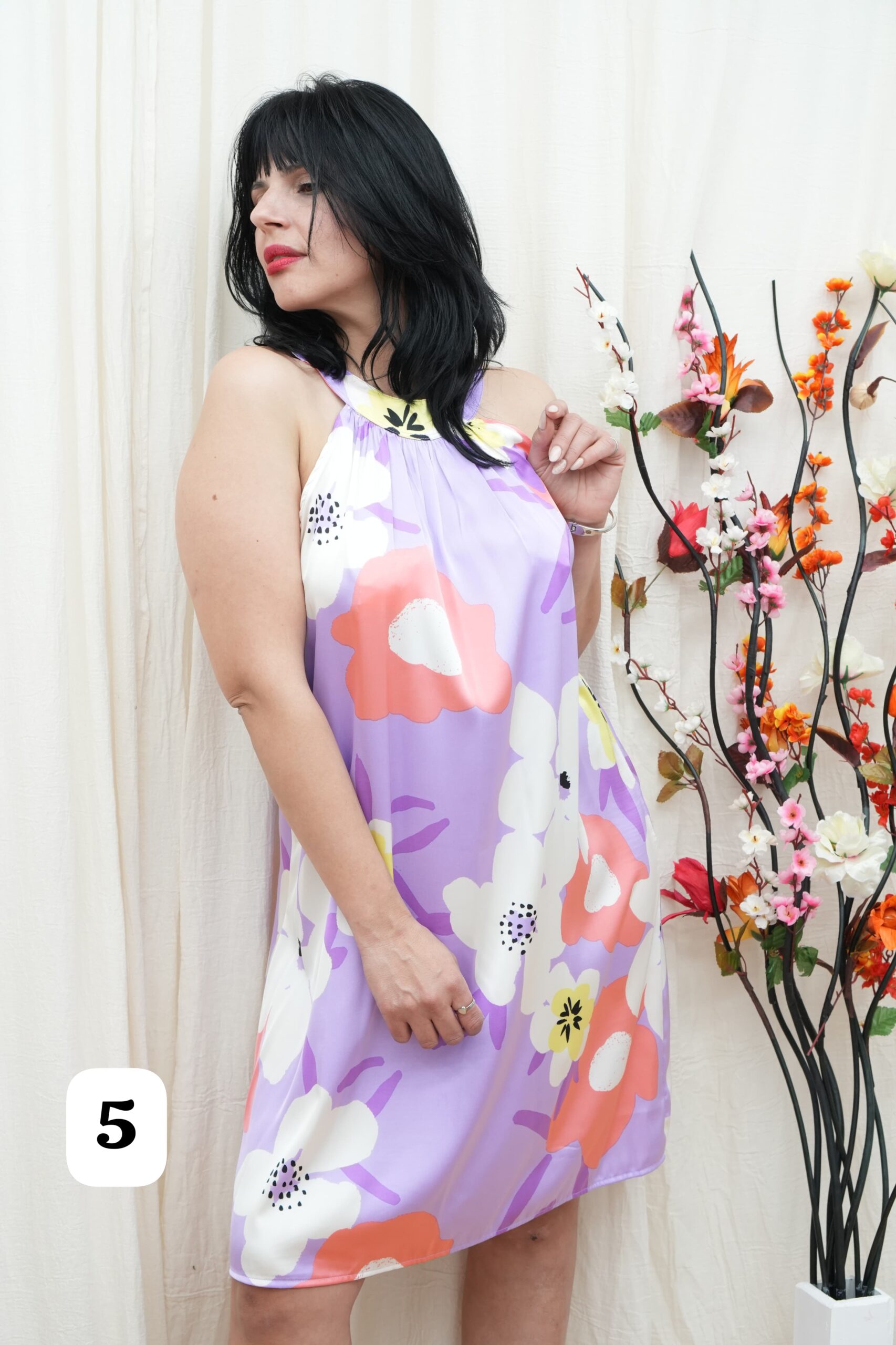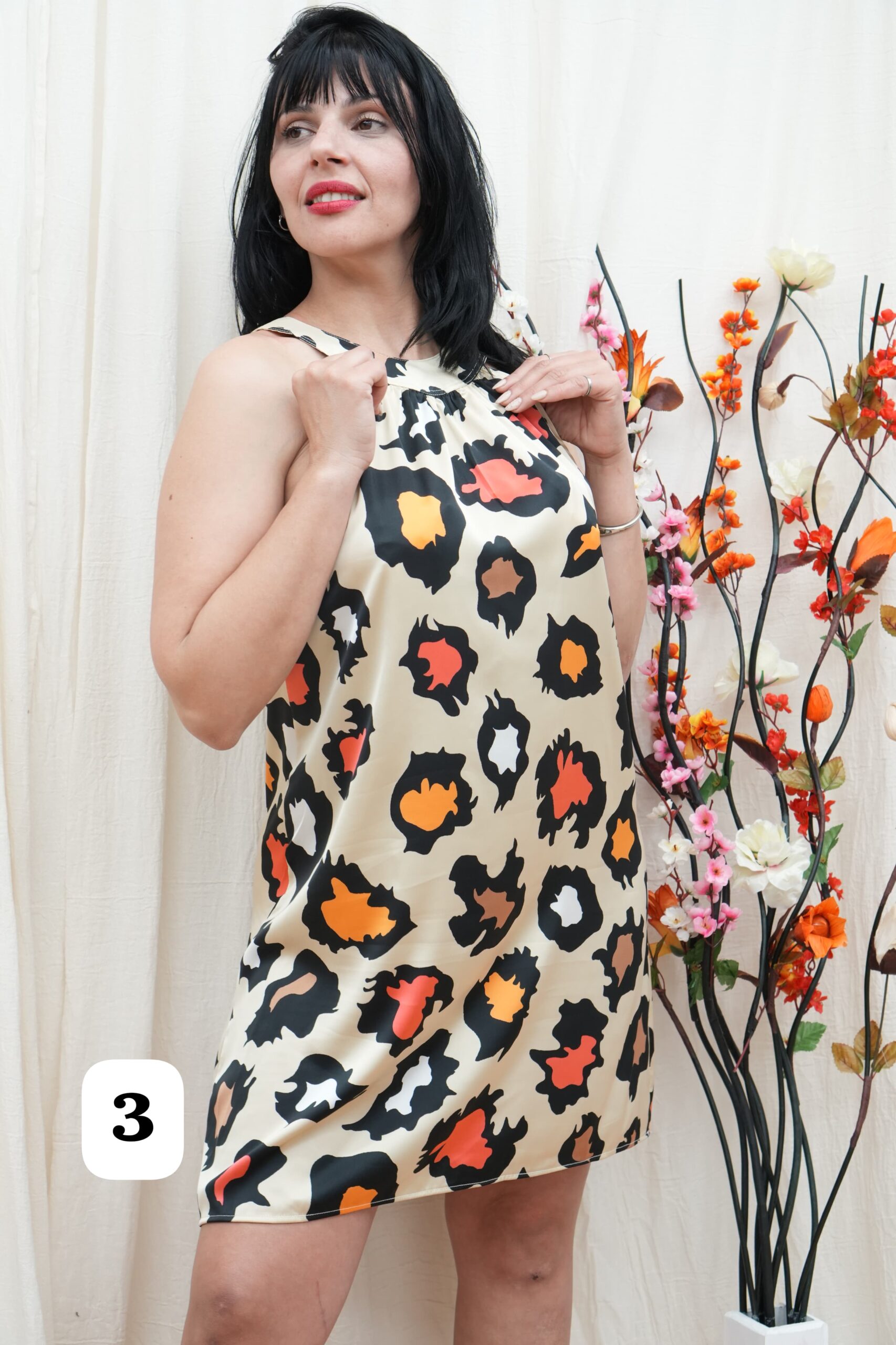 Vestido cuello americano de saten estampado Isabel