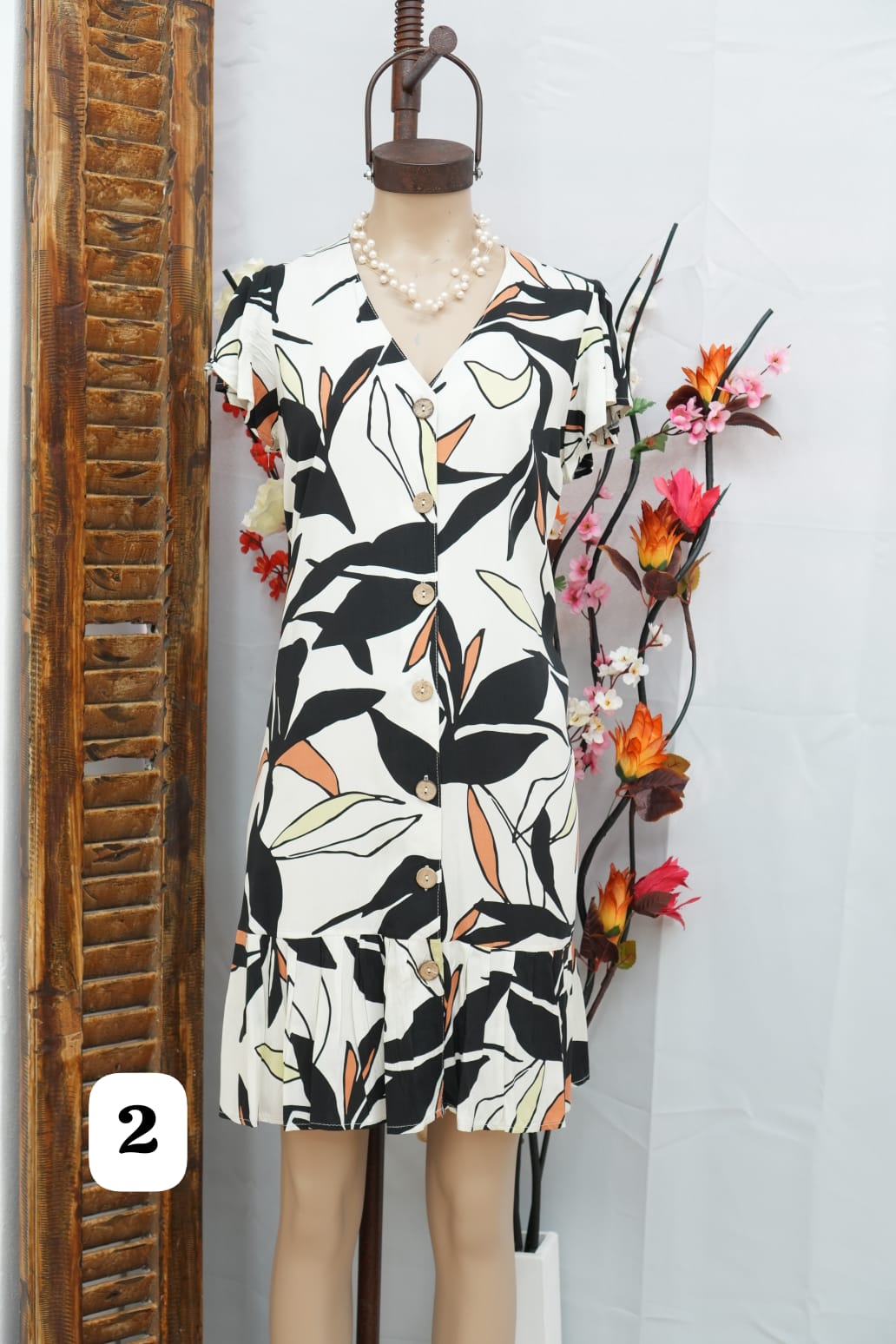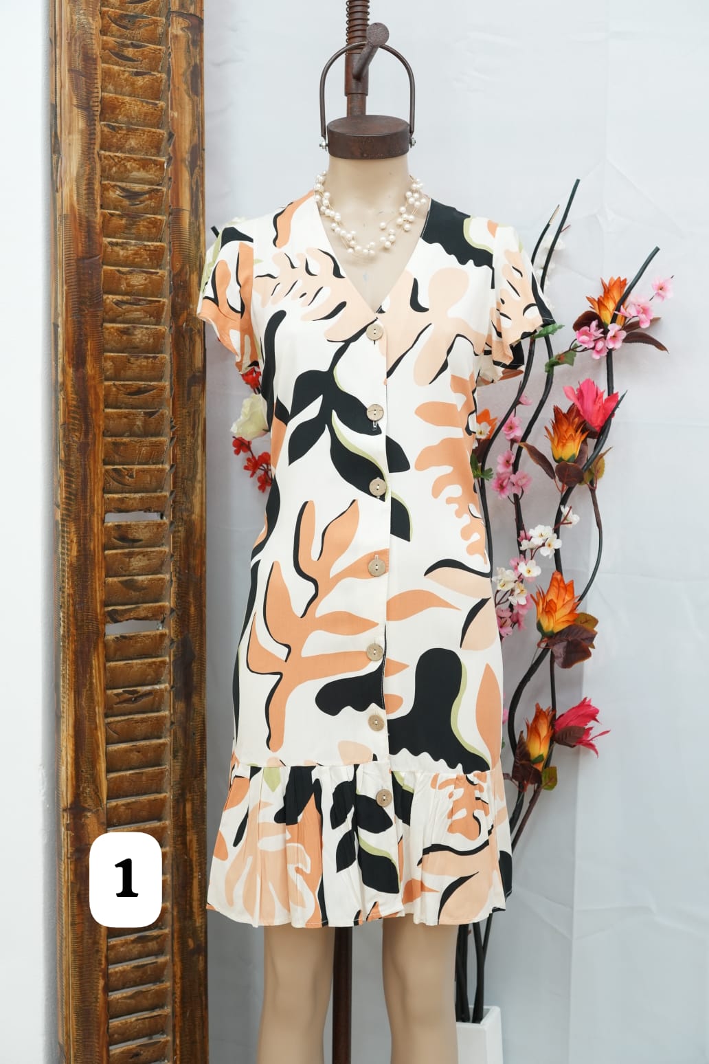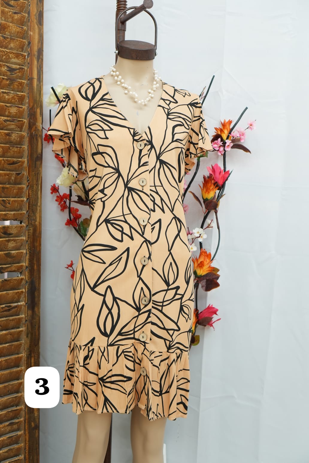 vestido de fibrana con botón a lo largo y volados