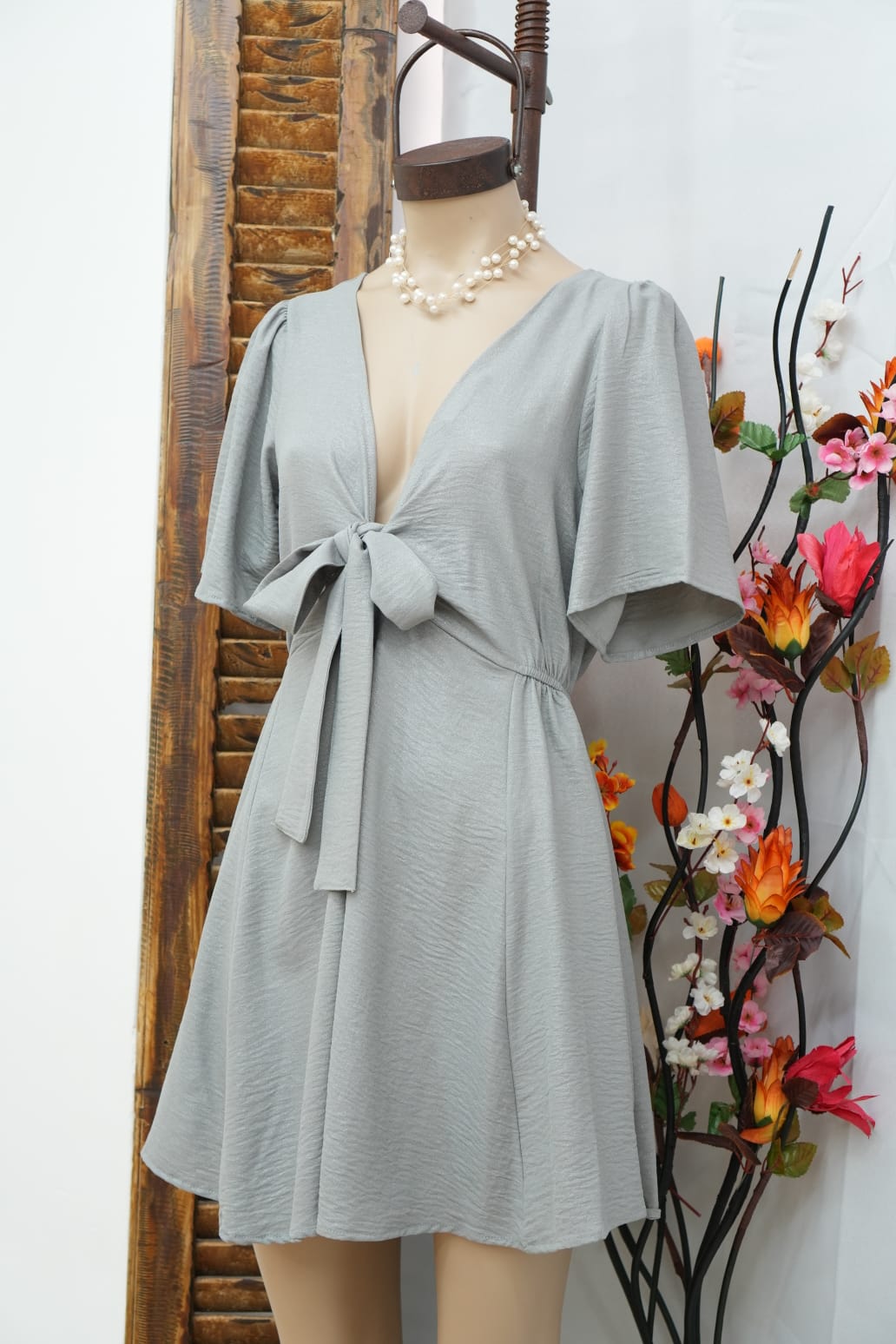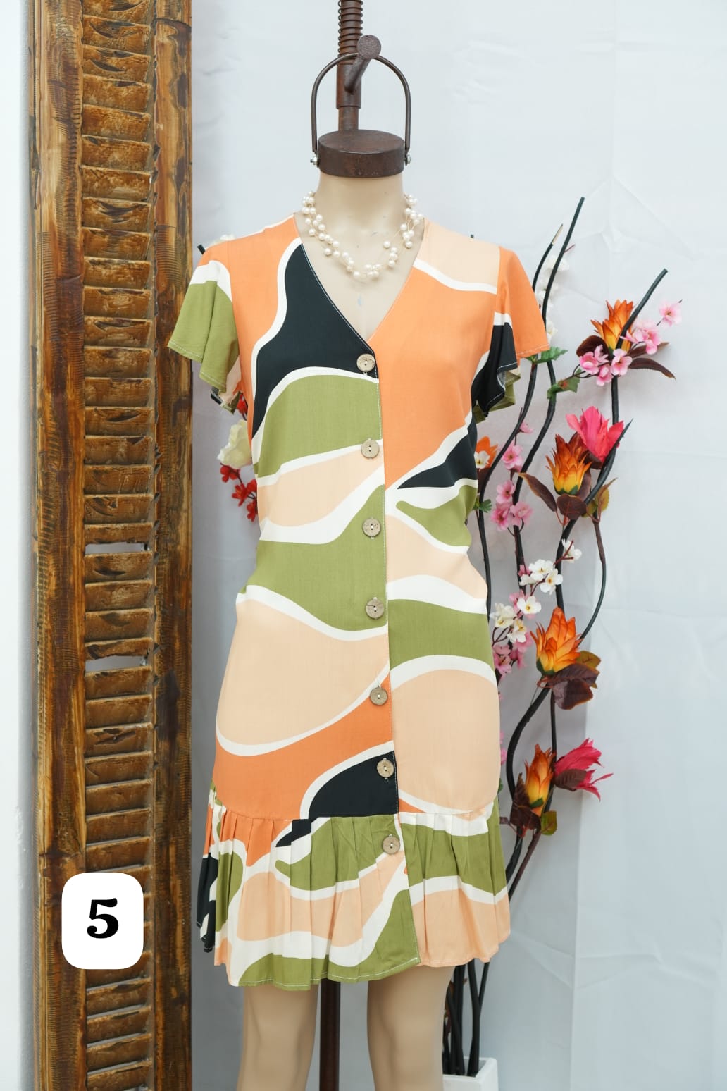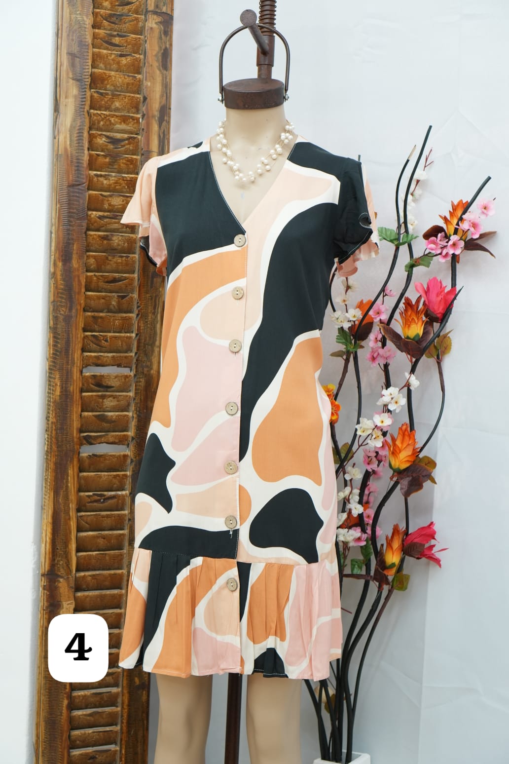 vestido de fibrana con botón a lo largo y volados